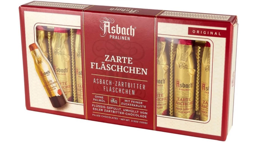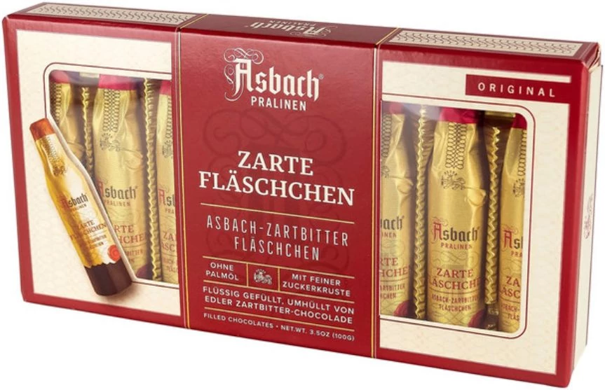 Asbach csokoládés üvegek ajándékdobozban - 8 üveg alakú csokoládé ablakos ajándékdobozban, mindegyik Asbach brandyvel töltve, finom cukorkrémmel és ízletes étcsokoládéval körülvéve!