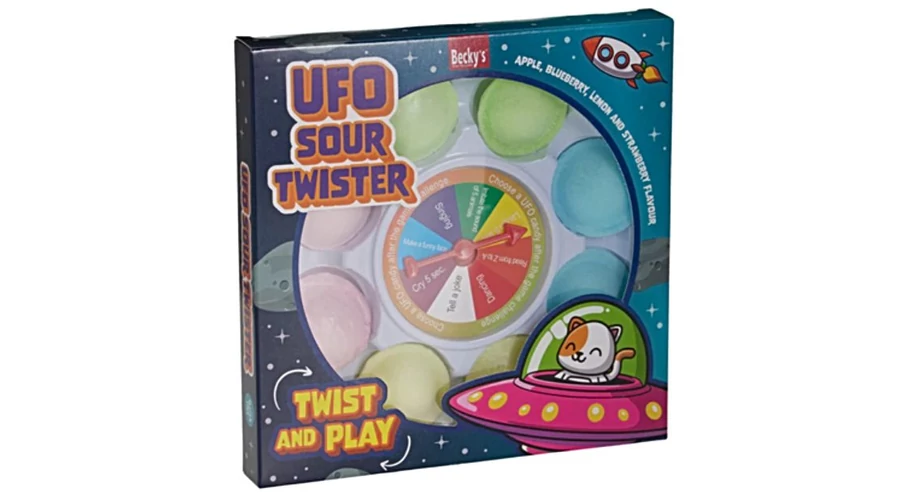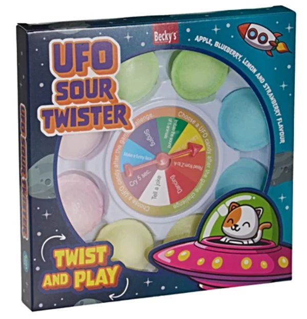 A Becky’s Ufo Sour Twister egy játék savanykás édességekkel, amely különleges UFO alakú ostyából és pezsgő, gyümölcsös töltelékből áll.