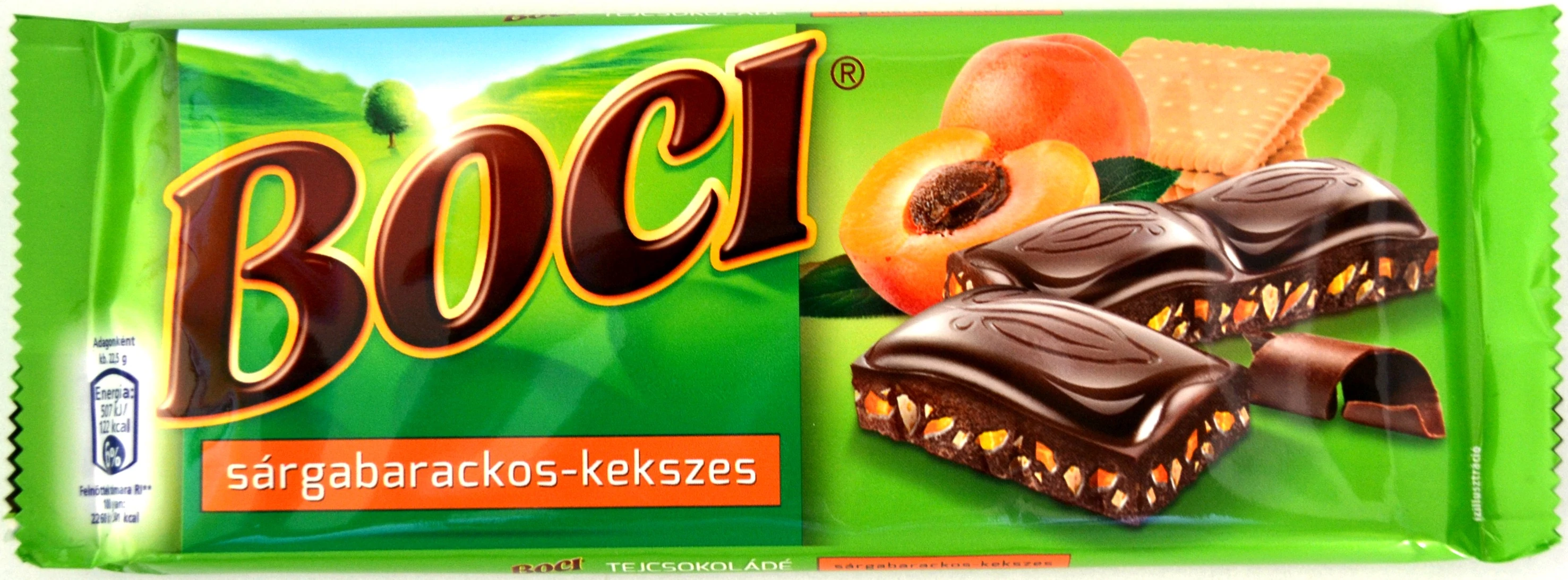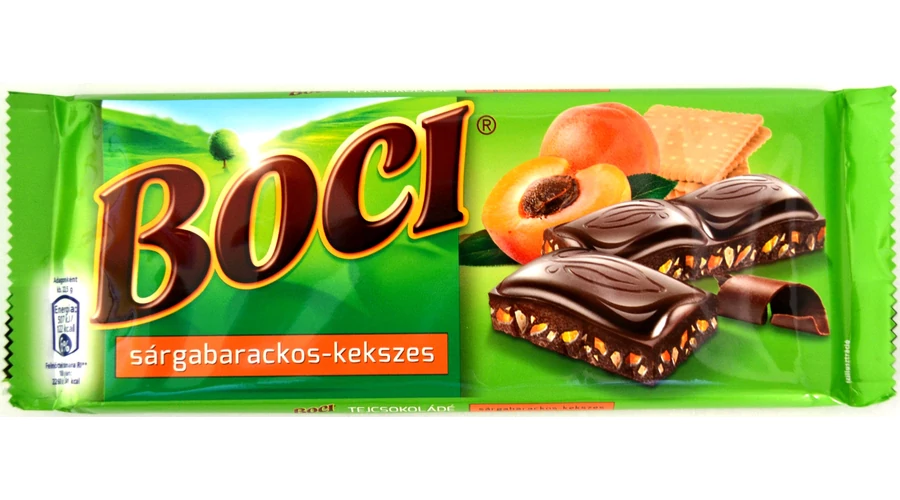 Boci sárgabarackos-kekszes tejcsokoládé 90 g.Kakaó szárazanyag a tejcsokoládéban legalább 33%.